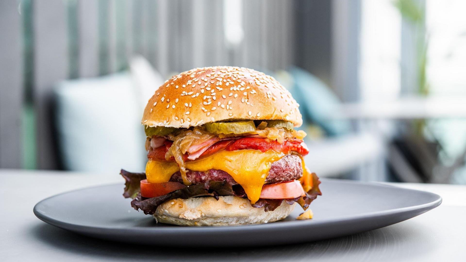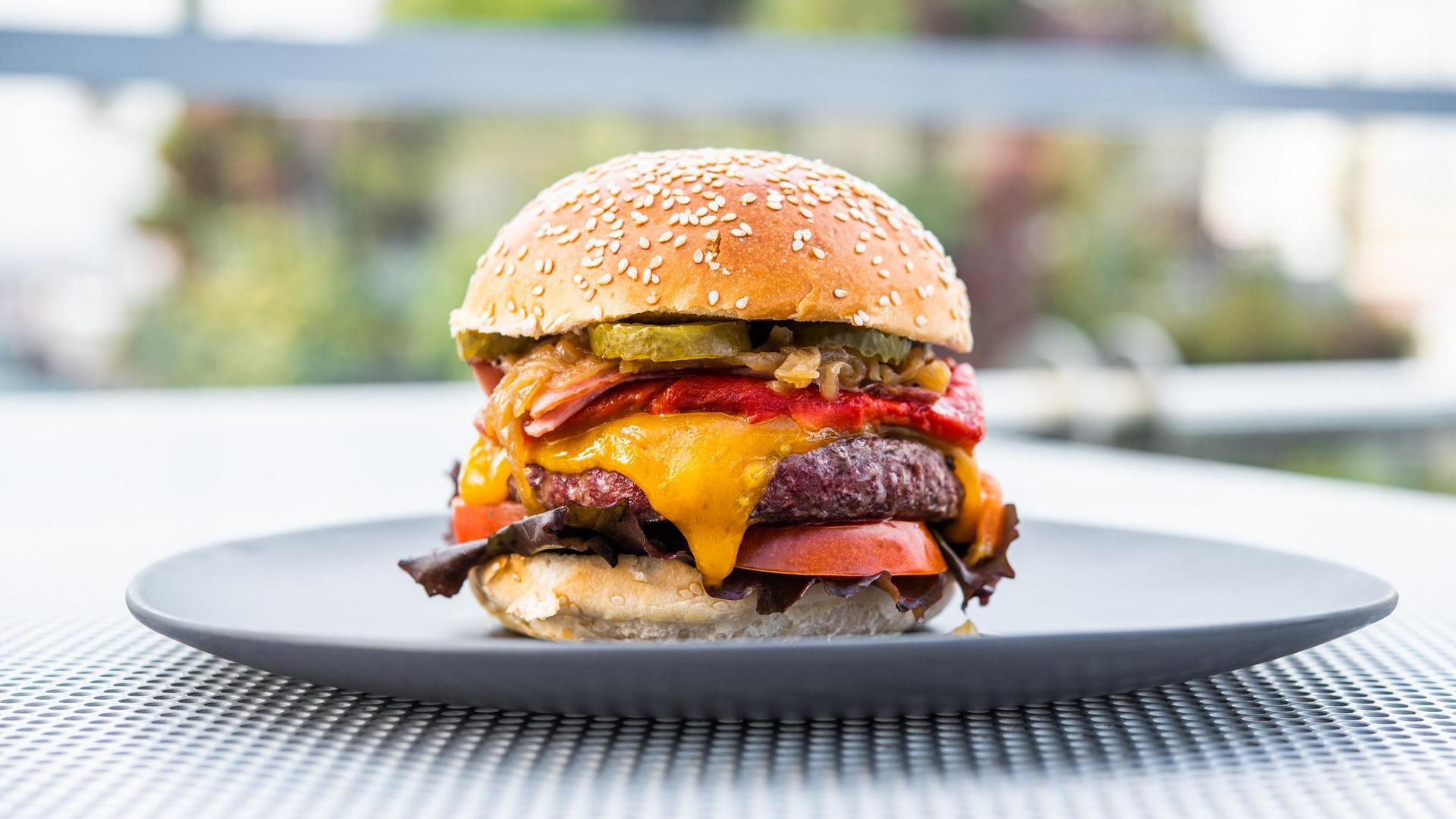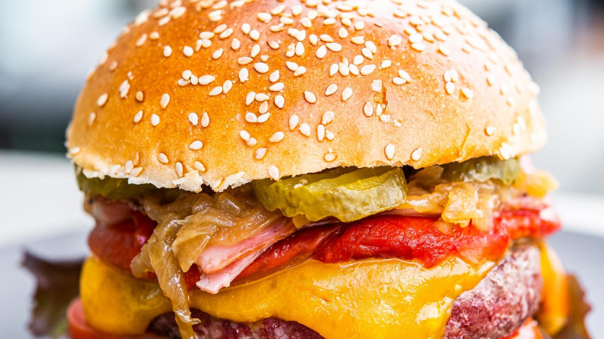Viande de bœuf, bacon, fromage cheddar, tomates, cornichons, laitue et petits oignons confits.